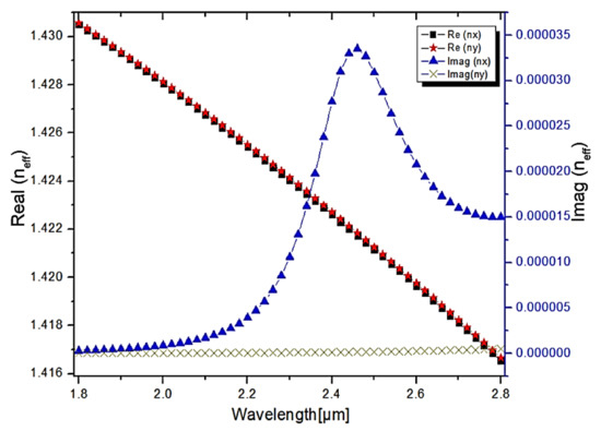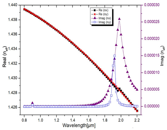 The dispersion relation between the real and imaginary values of the effective mode index (neff) is depicted in Figure 9. As shown in Figure 9, the real part of the core-guided mode decreases when the wavelength increases. The fiber dispersion characteristic is defined by the real values of neff [46], and the confinement loss is calculated through imaginary values of neff [47]. As depicted in Figure 9, the X-polarized mode couples with the plasmon mode, and hence, the core mode imaginary RI value increases at 1.98 µm. The observed confinement loss is 713 dB/cm at this wavelength, whereas the Y-polarized mode couples with the plasmon mode and has a confinement loss of 426 dB/cm at the wavelength of 1.92 µm. As per the result, at the wavelength of 1.98 µm, only the Y-polarized mode propagates, and the X-polarized mode is attenuated, and at the wavelength of 1.92 µm, only the X-polarized mode propagates, and the Y-polarized mode is attenuated. As a result, the proposed structure functions as a polarization filter by removing one of the polarized light waves at a particular wavelength.