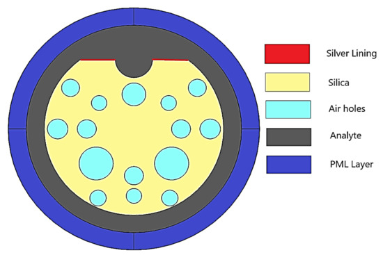 The optimized SPR-based polarization filter structure extends to sensing application by filling an analyte in the outer layer of the sensor. When the refractive index of the analyte changes, the structure resonant wavelength will shift. For the sensing purpose, the resonance wavelength shift (wavelength sensitivity) scheme is preferred because it results in a high level of sensitivity [48]. A schematic representation of the plasmonic sensor is shown in Figure 10. A PML layer is used to reduce scattering losses. The analyte’s indices influence the amount of light coupled into the silver layer (surface plasmon mode) and thus deciding light propagation through the core.