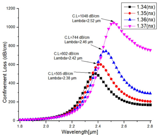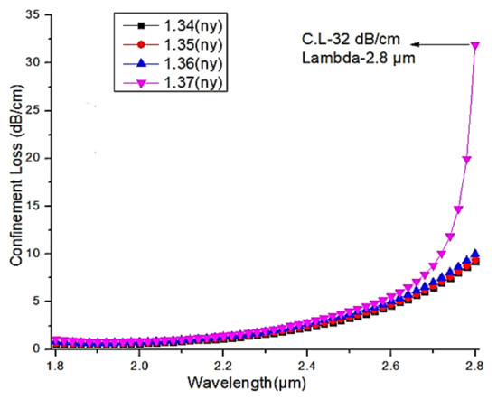 For the proposed sensor, a numerical investigation was carried out over a wavelength ranging from 1.8 µm to 2.8 µm, with a step value of about 0.02 µm. Additionally, for the analytes, the refractive indices ranging from 1.34 to 1.37 in the step of 0.01 were taken for the analysis. Figure 12 and Figure 13 illustrate the confinement loss measured in dB/cm for both the X and Y-polarization. As shown in Figure 12, the observed confinement losses at the X-polarization are 505 dB/cm, 602 dB/cm, 744 dB/cm, 1048 dB/cm at wavelengths of 2.38 µm, 2.42 µm, 2.46 µm, 2.52 µm, for the analyte refractive indices of 1.34, 1.35, 1.36, 1.37, respectively. From this analysis, the maximum confinement loss of about 1048 dB/cm is observed for the analyte refractive index of 1.37 at the operating wavelength of 2.52 µm, whereas in the Y-polarization, the observed confinement losses are very low, as depicted in Figure 12, and for the refractive indices of 1.34, 1.35, 1.36, 1.37, the recorded maximum values at the wavelength of 2.8 µm are 9.2 dB/cm, 9.5 dB/cm, 10 dB/cm, 32 dB/cm, respectively. Figure 13 is an extracted image from Figure 12 to display the confinement loss at the Y-polarization. From this analysis, it is clearly shown that the proposed PCF structure can be used as a refractive index sensor by shifting the confinement loss with respect to the wavelength in the X-polarization for the different analyte indices.
