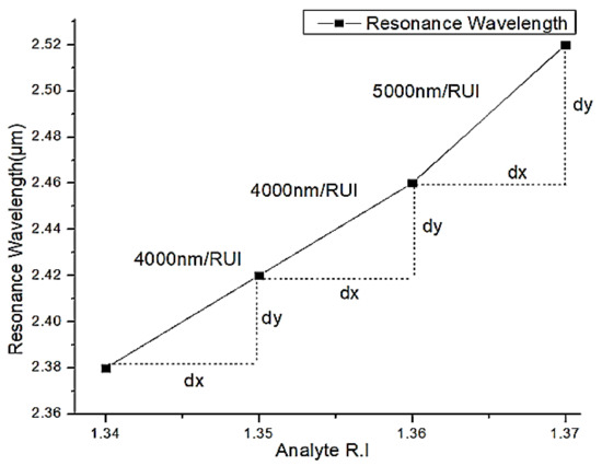 The sensitivity of the D-shaped silver lining plasmonic sensor is calculated using Equation (4). The sensitivity of the proposed system over the RI ranging from 1.34 to 1.37 is depicted in Figure 14. The observed sensitivity from RI 1.34 to 1.36 is 4000 nm/RIU, and the sensitivity is improved to 5000 nm/RIU for the RI ranging from 1.36 to 1.37. This sensor can be implemented to detect the small changes in the bio analytes and industry chemicals. The comparison of the proposed work with contemporary literature works is as depicted in Table 1. It shows a good wavelength sensitivity in the proposed work over the RI range from 1.34 to 1.37. This RI range covers the sensing of many industrial solvents and bio-analytes [50] RIs.