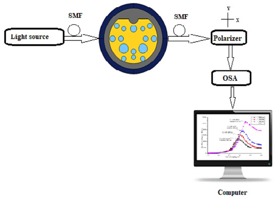 Figure 15 depicts the experimental arrangement for the proposed reconfigurable D-shaped SPR filter/sensor. A light source with a wide spectrum is launched into the proposed fiber through SMF for better coupling. Depending on the analyte being filled or unfilled around the proposed fiber, this setup can act as a polarization filter or sensor. As a sensor, the addition of a polarizer gives better visibility regarding the confinement loss under a particular polarization. As per the RI of the analyte, the fiber mode loss varies at a particular wavelength, and it can be recorded on an optical spectrum analyzer (OSA) and computer connected to it. By analyzing the data from the computer, the unknown analyte RI can be identified through the wavelength shift of peak loss in SPR between the core mode and the plasmon mode.