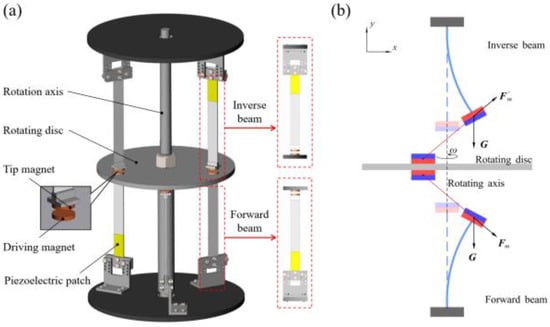 Figure 1 shows the schematic diagram of the rotational magnetic couple piezoelectric energy harvester in this article. As shown in Figure 1a, the rotational energy harvester is divided into two parts, inverse cantilever beams and forward cantilever beams of 304 h stainless steel with a piezoelectric patch glued to the root of the beam and fixed to the upper and lower discs, respectively. A tip magnet is mounted at the free end of each cantilever beam by two L-plates, which correspond to the magnets on the rotating disc, and the same magnetic poles are close to each other. The rotation provided by the servo motor is to simulate the conditions of the direct connection of the energy harvester to the rotating machinery or the rotation provided by the blades rotating in the flow field. During the working process, the magnets on the rotating disc and the tip magnet of the beam are coupled periodically, and the repulsive force generated by the same magnetic pole will force the beam to bend, and as the driving magnet continues to rotate away from the tip magnet, the beam will produce damped-free-vibration under its elastic force before the next driving magnet comes. At the same time, the vibration energy is converted to electrical energy by piezoelectric energy. At this moment, frequency up-conversion is completed, and the low rotation frequency is converted into the higher vibration frequency of the beam so that the harvester can have a high energy harvesting efficiency even at a rotation frequency far below the resonance frequency of the beam. Then, the working bandwidth is improved.