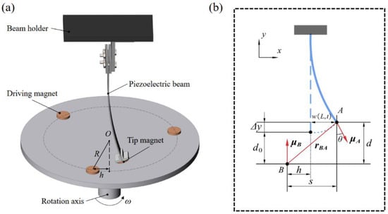 where represents the vertical deformation due to the horizontal deformation of the cantilever beam, represents the thickness of the tip magnet A, and h () is the horizontal distance between the magnet B and the magnet A at . The distance between magnets perpendicular to the vibration direction of the beam is so small that it is negligible. R is the radius of rotation of the magnet B, is the angular velocity of rotation. For tip magnet A and rotating magnet B, the magnetic moment vector can be expressed as:
