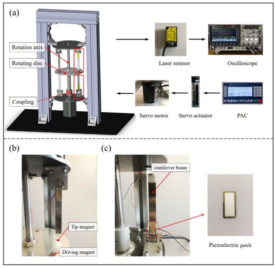 To study the dynamic characteristics and energy harvesting performance of the proposed harvester, an experimental setup is shown in Figure 3. It was built and the lateral displacement and voltage output of the setup was tested at different rotational speeds. For more accurate control of the rotational speed, the rotation of the turntable was provided by a servo motor (SGM7J Yaskawa, Kitakyushu, Japan), and the parameters of rotary motion are set by Programmable Automation Controller (PAC), and then the matching servo actuator (SGD7S, Yaskawa) can control the motion of the servo motor. The purpose is to simulate the rotational force provided by the direct connection to the rotating equipment or the blades in the flow field. Three uniformly distributed cylindrical NdFeB magnets are glued to each of the top and bottom sides of the turntable, and the magnets have a size of D12 × 2 mm³ (D is the diameter). In addition, laser displacement sensors (HG-C1050, HG-C1100, Panasonic, Osaka, Japan) are used to measure the lateral displacement of the beams (not at the tip mass). Each beam has a tip magnet at the free end, again a cylindrical NdFeB magnet of the same size. In addition, the fixed end of the beam is glued with a lead zirconate-titanate (PZT) piezoelectric ceramic (K2512U1, Thrive, Tokyo, Japan) on one side, and the length of the piezoelectric beam is 90 mm. An oscilloscope (MDO-2204ES Gwinstek, New Taipei, Taiwan) was used to monitor and record the displacement and output voltage of the harvester, which was used to analyze the amplitude-frequency characteristics and energy harvesting efficiency of the piezoelectric beam.