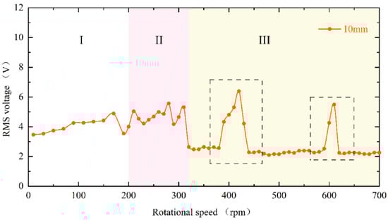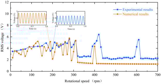 In the previous section, the dynamic characteristics of the energy harvester at different speeds and their mechanisms were discussed. To illustrate it more intuitively from theory, numerical simulations and experimental results are compared in Figure 16. In the speed range of 10–310 rpm, the experimental test results are in better agreement with the numerical simulation results. At 320 rpm, the reduction in energy harvesting efficiency due to the inability of the piezoelectric beam to respond in time was predicted. In addition, at 400 rpm, the resonance-induced frequency down-conversion mechanism was successfully predicted and the RMS voltage was re-escalated. The discrepancy around 600 rpm may be because the piezoelectric beam in the experiment is affected by the tip gravity and cannot guarantee absolute verticality and equilibrium, which makes the experimental piezoelectric beam more susceptible to receiving the effect of the down-conversion mechanism.