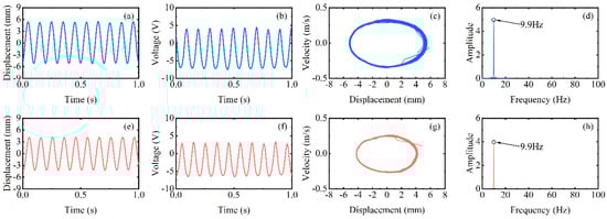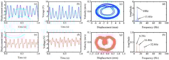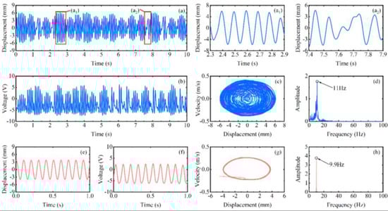 However, at high-frequency excitation, the piezoelectric beam will not always be at low amplitude. Figure 4’s black dotted square shows that when the speed is increased near 400 rpm (20 Hz) and 600 rpm (30 Hz), the RMS voltage appears to re-rise. The excitation frequency at this moment is exactly two and three times the natural frequency of the piezoelectric beam, but the piezoelectric beam resonates at its natural frequency (as shown in Figure 7d,h). At this point, a frequency down-conversion mechanism appears, benefiting from which the amplitude increases again and the RMS voltage rises. As a result, the harvester designed in this article has a wider bandwidth, which is different from the case of a simple harmonic piezoelectric vibratory harvester, which has only one optimal frequency and a narrow bandwidth.