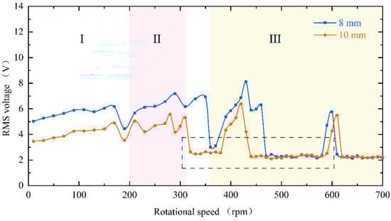 When changing the magnitude of the magnetic force, the dynamic characteristics of the piezoelectric beam are consistent and can be seen in Figure 8. It is still divided into three regions. However, the difference is that the decrease in the magnet spacing, i.e., the increase in the magnetic force, will make the piezoelectric beam respond more rapidly, and the beam will enter the mode indicated by region III later. Furthermore, as shown in the black dotted square in the figure, the low-energy-harvesting region will be a little smaller at the 8 mm spacing. Conversely, this means that the increase in excitation will result in a wider bandwidth.