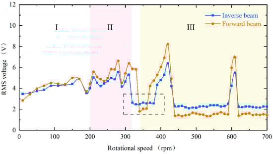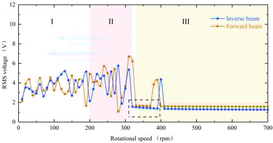 The experimental results of the RMS voltage comparison between the inverse beam (blue line) and forward beam (red line) at 10 mm magnet spacing.