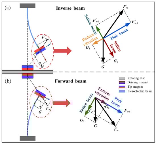 Figure 1b shows a detailed diagram of the magnetic plucking process of the harvester, where G is the gravitational force, and and are the periodic non-linear magnetic forces generated by the driving magnet on the tip magnet, and its normal component makes the beam vibrate. Compared with the previous toggle and impact type, the magnetic plucking type has higher safety, longer service life, and less noise; the magnitude of excitation is also easily adjusted by the magnitude of magnetic force. Moreover, piezoelectric beams have several rotational speeds that can resonate, which can maintain high energy harvesting efficiency in a wider frequency range.