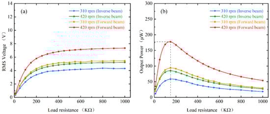 Under real energy harvesting performance, it is closely related to the load resistance connected to the piezoelectric patches. To test the effect of load resistance on the output power, Figure 11 shows the average power of the inverse beam and forward beam at different load resistances at 10 mm magnet spacing. Initially, the output power increases with the increasing resistance until it approaches 150 KΩ. At 420 rpm (21 Hz), the output power of the forward beam even reaches 177 μW and the maximum power of the inverse beam is 85.2 μW. Specifically, this result is obtained because the piezoelectric beam resonates around its natural frequency of about 10 Hz due to the down-conversion mechanism. Meanwhile, the two beams also reached their maximum output power at 310 rpm (15.5 Hz) with 93.8 μW and 58.5 μW, respectively. However, with a further increase in the load resistance, the output power instead continues to decrease. The experimental results prove that the optimal load resistance of the energy harvester is about 150 KΩ. Meanwhile, the resistance that maximizes the power can be calculated from the following equation []: