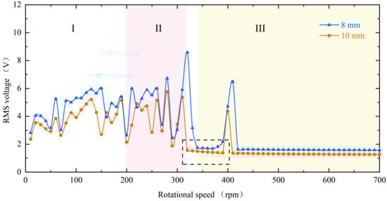 Finally, to gain insight into the characteristics of the rotating energy harvester, different speeds and configurations were explored through numerical parameter studies. For the numerical simulations, Equations (1)–(4) were solved in MATLAB (R2017a, MathWorks, Natick, MA, USA) software using the Runge–Kutta Method. The initial parameters used for the numerical simulations are shown in Table 1. The effect of these parameters on the energy harvesting performance under different conditions is investigated. It is important to note that in the following parametric studies when changing one parameter, the other parameters are the same as the initial parameters. Figure 12 shows the simulation results of the RMS voltage at different speeds for magnet spacing of 8 mm and 10 mm, respectively. The phenomenon in the dotted square shows that it is consistent with the results obtained in the experimental section. That is, the low capture energy region decreases as the magnet gap decreases (i.e., the excitation increases), and this means that a larger excitation is accompanied by a wider working bandwidth. The RMS voltage also increases due to the reduction in the gap.