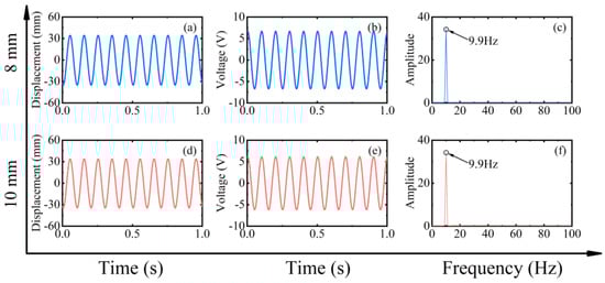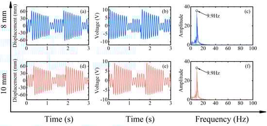 Simulation results of magnet spacing of 8 mm (blue line) and 10 mm (red line) at 400 rpm (20 Hz) in frequency down-conversion mechanism, (a,d) are the corresponding measured displacements, (b,e) are the corresponding measured output voltages, and (c,f) are the corresponding power spectrums.