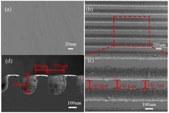 SEM image of groove morphology. (a) SEM image of titanium alloy plate. (b) Low magnification of the groove. (c) High magnification of the groove. (d) SEM image of the groove side view.