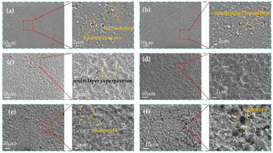With a current of 0.5 A, only a small amount of micro-bumps and crater-like structures formed by sputtering can be formed in localized areas, and the titanium alloy substrate can be seen in some areas, as shown in Figure 4a. The density of microtextures is small. As the current increases, irregular bumps appear on the surface of the titanium alloy, and the density of the surface texture increase accordingly, as shown in Figure 4b,c. When the current reaches 2 A, the microtextures start to superimpose, and the surface quality is uniform, forming “islands”. The microtextures not only increase in size and density but also are uniformly distributed on the titanium alloy surface, so the roughness is greatly improved, as shown in Figure 4d. When the low-voltage current is increased to 2.5 A, the energy continues to become larger, the surface quality starts to deteriorate, and micro-cracks appear, as shown in Figure 4e. When the current was increased to 3 A, copper electrodes were ablated, micro texturing cracks increased, and surface quality was poor, as shown in Figure 4e.