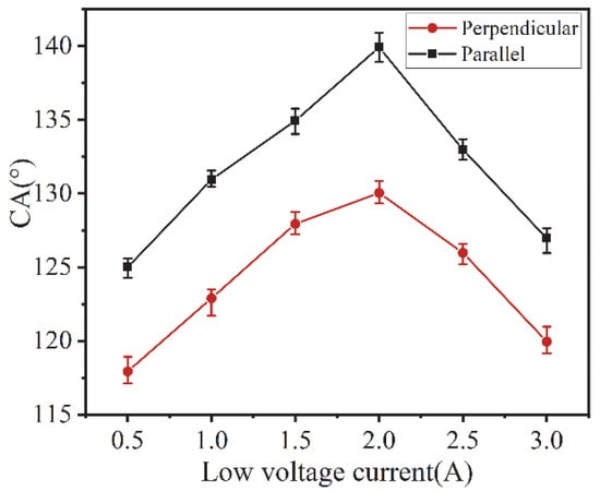 The experimental results show that the parallel contact angle and perpendicular contact angle of the surface of the macro-micro composite structure formed under different low-voltage electric currents are greater than 90°, which exhibits hydrophobicity. Due to the macro groove structure, the parallel contact angle is larger than the perpendicular contact angle. As the low-voltage electric current increases from 0.5 A to 2.0 A, the directional contact angle increases to a maximum value, reaching 140° for the parallel contact angle and 130° for the perpendicular contact angle. When the current continues to increase, due to the excessive energy, the micro-scale structure of the groove surface showed larger craters and cracks, the surface consistency became poor, and the directional CA all showed a decreasing trend.