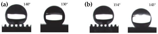 Macro-micro composite structure surface formed by using the HV-μEAM technique on the macro groove edge enables the transition from hydrophilic to hydrophobic for titanium alloy plates. Figure 8a shows that the contact angle reached 140° parallelly and 130° perpendicularly after machining the microstructure on the macrostructure at a low voltage current of 2.0 A. It is due to the presence of the macro-micro composite structure that a titanium alloy directional hydrophobic surface was prepared, and its directional hydrophobic effect is superior to that of the grooves after fluorosilane modification. After the low surface energy modification on the obtained macro-composite surface, the directional contact angle was further improved, which reached 154° in the parallel direction and 143° in the perpendicular direction, as shown in Figure 8b.