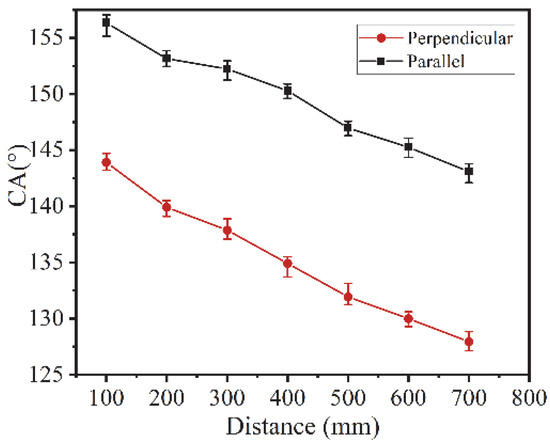 To explore the wear resistance of the directional hydrophobic surface of the titanium alloy, friction and wear experiments were carried out. The 600# SiC sandpaper was used, and the specimen was pushed along the direction parallel to the groove with a uniform motion at 100 mm intervals under a load of 100 g, reciprocating. The experiments were conducted in six groups, and the average values were taken. The results obtained for each contact angle are shown in Figure 9. It can be seen from the experimental results that the CA in all directions decreases with the increase of friction distance. At the friction distance of 700 mm, the parallel contact angle and perpendicular contact angle still retained the directional hydrophobicity. With the increase of friction distance, the difference between the parallel contact angle and perpendicular contact angle gradually became larger, from the initial 11° to 15°. The reason is that the macrostructure is more visible. The specimen was mechanically damaged during sandpaper friction, resulting in a decrease in contact angle. As the friction distance increases, the contact angle shows a decreasing trend. When the friction distance reaches 400, the contact angle in the perpendicular direction is 136°, and the contact angle in the parallel direction is 150°. However, the microstructures were not completely destroyed during the friction process, so the specimens did not immediately change to hydrophilic surfaces and still exhibited directional hydrophobicity.
