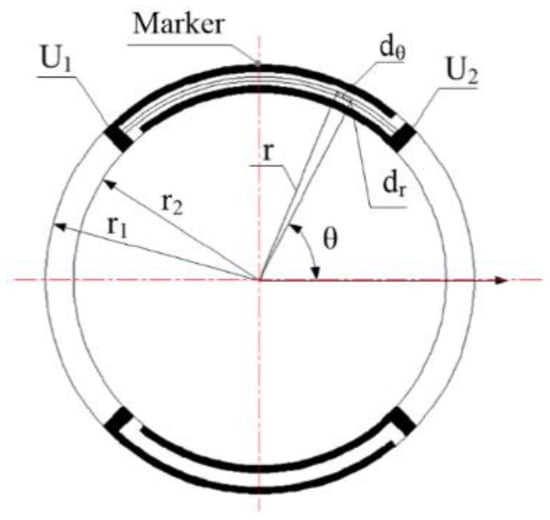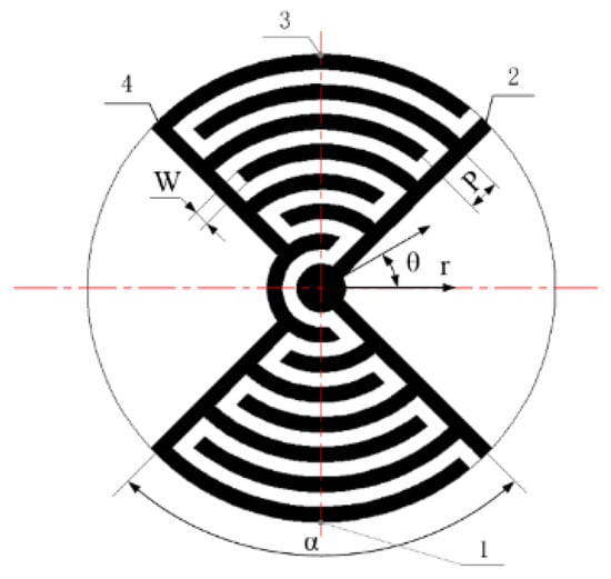 An LRE piezo actuator in the shape of a circular column is shown schematically in Figure 1. The disk surface is divided into an electrode region and a non-electrode region. The interdigitated ring electrodes are concentrated in a certain district so that the driving signal can be output centrally. The electrode consists of a series of branch electrodes drawn from the positive and negative main electrodes, respectively. The electrodes on the upper and lower surfaces are in exactly the same position.