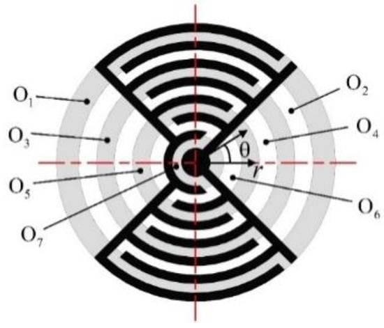 Due to the characteristics of the electrode, the disk is divided into rings along the centerline of the branch electrodes, as shown in Figure 2. A type 1 piezoelectric ring includes O1, O3, O5 and O7. These have similar electric field distributions and the same polarization axis. They are assumed to have the same piezoelectric constants. A type 2 piezoelectric ring includes O2, O4 and O6. These have similar electric field distributions and the same polarization axis. These are assumed to have the same piezoelectric constants. The two piezo-ring pairs have opposite polarization directions. The piezoelectric constants are opposite to each other. Because of the uniformity of the material, it is assumed that the mechanical constants of all piezo rings, including the elastic modulus and the Poisson ratio, are the same.