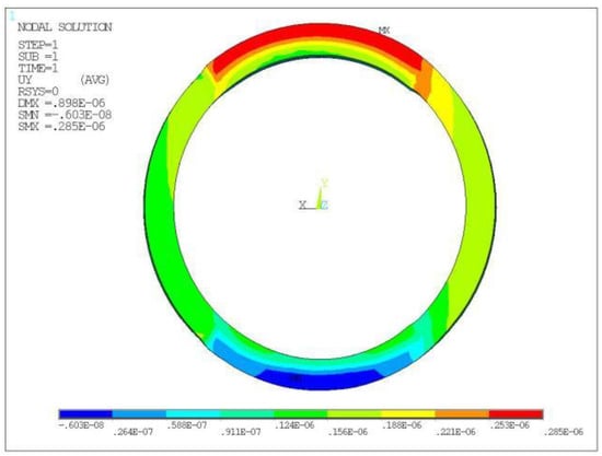 According to the structural characteristics of the LREs piezo disk, an overall model was established in ANSYS. The 10° arc surface near 270° of the LREs piezo disk, as shown in Figure 1, was constrained. To analyze the influence of single ring loading on the displacement of the actuator, a single electric ring loading analysis was carried out. A voltage of 200 V was then applied to the positive electrode of the piezo ring, and 0 V was applied to the negative electrode. A static analysis was performed to obtain the radial displacement cloud of the LRE piezo disk produced by a piezo ring, as shown in Figure 6.
