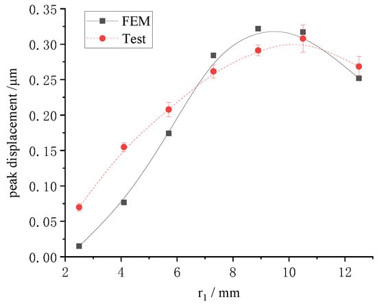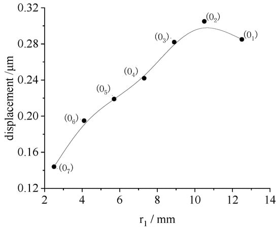 To study the displacements of the LRE piezo disk, the piezo rings O1~O7 were energized separately. The radial displacements of the sample under single-electrode-ring excitation were detected. The effect of the piezo ring radius on the peak displacement is shown in Figure 11. For comparison, the displacement results of the single-electrode-ring loading in Section 3.2 are summarized in Figure 11.