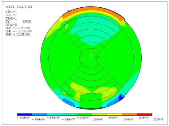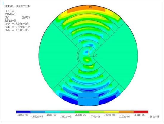 The LRE piezo disk was loaded with full electrodes, and each piezo ring was simultaneously excited by a voltage to study the radial displacement. The positive electrodes of all piezo rings were loaded with 200 V, and the negative electrodes were loaded with 0 V. The constrained area was unchanged, and a static analysis was performed. The displacement is shown in Figure 7. Due to the accumulation of piezo ring displacements, the maximum displacement of the disk reached 1.61 μm at the displacement monitoring mark. The displacement values of the full-electrode excitation were greater than the sum of the displacements of the single-electrode rings excitation separately. This showed that the displacement of the disk was not an algebraic sum of the displacements of each ring.