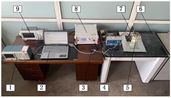 Experimental platform for actuator displacement detection: 1. Tektronix AFG1022 signal generator (Tektronix, Inc., Johnston, USA); 2. Computer; 3. Pulian TP-LINK switch (TP-Link Ltd., Shen, China); 4. Spectral confocal controller IFC2451 (Micro-Epsilon Measurement Technology Management Company Group. Bavaria, Germany); 5. Samples; 6. Three-stage shock-absorbing stand; 7. Laser probe IFC2403-0.4 (Micro-Epsilon Measurement Technology Management Company Group. Bavaria, Germany); 8. Antai ATA-2021 high voltage amplifier (Aigtek Electronic Technology Ltd., Xian, China); 9. Tektronix TDS2024C oscilloscope (Tektronix, Inc., Johnston, IA, USA).