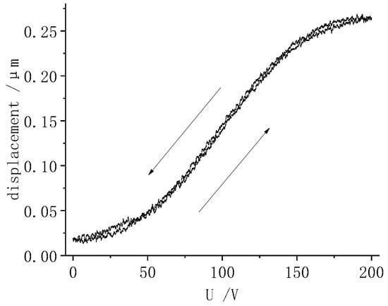 A −200~200 V sinusoidal voltage with a frequency of 0.2 Hz was applied to a given piezo ring. The displacement response curve of the sample was obtained, as shown in Figure 10. As can be seen from Figure 10, the displacement curve of the middle section is nearly linear. The radial tensile displacement peak was 0.27 μm.