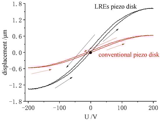 The radial tensile displacement peak of the conventional electrode piezo actuator was 0.64 μm. The displacement of the LREs piezo actuator was 2.5 times that of the conventional electrode piezo disk. It was evident that the LRE piezo actuator exhibited significant displacements. Since the displacements of the LRE piezo actuator were superimposed on the displacements of the individual piezo rings, they exhibited more obvious hysteresis characteristics. There was a clear gap between the ascending and descending segments of the displacement curve. The rising and falling segments of the displacement response curve of a conventional actuator essentially coincided.