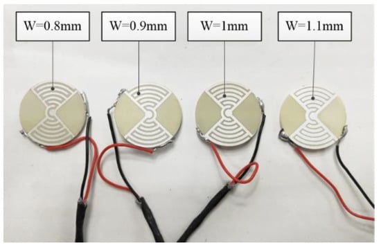 The electrode width is a key dimension. It determines the electric field strength of the sample. In the process of sample preparation, any errors in the width will impact the polarization of the piezoelectric materials. This will affect the piezoelectric performance of the sample. Therefore, the effect of electrode width on the displacements of LREs piezoceramic disk needs to be studied. Some LRE piezo samples were prepared. The electrode widths were 0.8 mm, 0.9 mm,1 mm and 1.1 mm. The electrode center distance was 1.6 mm. There were seven pairs of electrodes. The samples are shown in Figure 13.