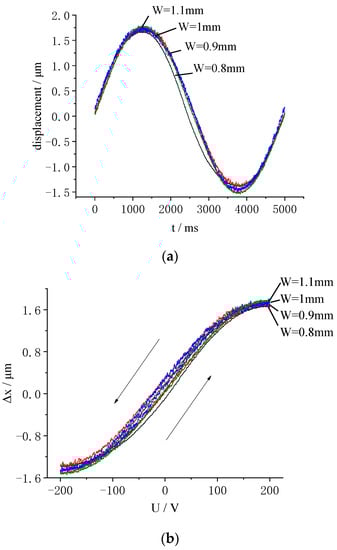 A sinusoidal signal with a frequency of 0.2 Hz and an amplitude of 200 V was applied to the samples. The displacement time history is shown in Figure 14a, and the displacement responses are shown in Figure 14b. As shown in Figure 14b, the middle segment of the curve was linear. As the voltage increased, the displacement increased linearly. There was a high level of repeatability of the curves shown in multiple displacement tests. All the displacement curves were relatively close to each other. As the electrode width increased, the maximum radial elongations of the LRE piezo sample increased from 1.68 μm to 1.81 μm, while the maximum radial contractions increased from 1.39 μm to 1.51 μm. These values did not change significantly with width. Therefore, the influence of the electrode width on the radial displacement of the LRE piezo disk was small. There was a relatively small gap between the rising curve and the falling curve, which was caused by the hysteresis effect of the piezoceramics. During the voltage rise and fall, there was a gap in the displacement curve of the LRE piezo disk. The rising and falling intervals of the displacement response curve did not coincide.