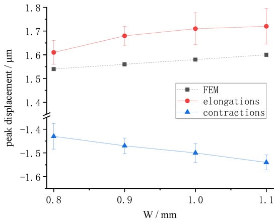 When the voltage was 200 V, the peak displacement was obtained with multiple electrode widths. The finite element results for radial displacement and the test results are summarized in Figure 15. The displacement curve was gentle. The increase in displacement with increase in electrode width was relatively small. Both the test and the finite element analysis were consistent with this law. This was because the electric field increased as the electrode became wider, with the actuator showing better drive performance.