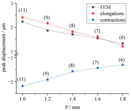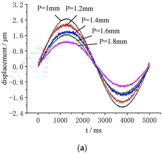 A sinusoidal voltage of 0.2 Hz and 200 V was applied to the samples. The displacement time history and the displacement response are shown in Figure 17. As can be seen from Figure 17, with decrease in electrode center distance, and increase in piezo rings, the radial displacement of the LRE piezo disk was significantly improved. When P was 1.8 mm, the maximum displacement was only 1.32 μm. When P was 1 mm, the maximum displacement reached 2.47 μm. At the same time, the maximum contractions increased from 1.09 μm to 2.13 μm.