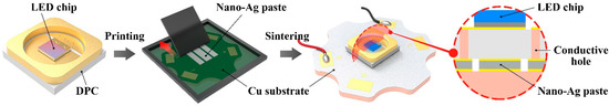 In this experiment, the bonding materials we used were commercial products. The nano-Ag paste was purchased from Advanced Connection Technology Co., Ltd. (Shenzhen, China). The Au80Sn20 soldering flakes were purchased from Turing Electronic Technology Co., Ltd. (Shanxi, China). The chip used was a high-power vertical packaging blue LED chip (1 W) with AlN DPC ceramic substrate. The thermoelectric separation heat sink used was hexagonal Cu substrate. The dehydrated ethanol and acetone were purchased from Sinopharm Chemical Reagent Co., Ltd. (China).