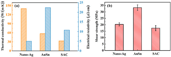 Figure 2a shows the thermal conductivity and electrical resistivity of different bonding materials. The thermal conductivity of nano-Ag, Au80Sn20, and SAC305 is 140, 57, and 33 W/(m·k), respectively. The electrical resistivity of nano-Ag sintered at 220 °C is 4.9 μΩ·cm, and that of the Au80Sn20 and SAC305 is 22.4 and 10.8 μΩ·cm, respectively. After sintering at 220 °C, the electrical resistivity of nano-Ag is close to the theoretical value of metal Ag, indicating a complete sintering. It can be seen that the nano-Ag paste has the best thermal conductivity and lowest electrical resistivity. Figure 2b presents the shear strengths of the bonding joints with different bonding materials. The shear strength of the joints with nano-Ag, Au80Sn20, and SAC305 is 20.3, 33.3, and 17.4 MPa, respectively. Au80Sn20 interconnection layer has the highest shear strength, which may due to the inherent low porosity and high density. The higher temperature will bring higher sintering driving force and accelerate the sintering and diffusion of nanoparticles. Therefore, it could be that when the sintering temperature continues to rise, the shear strength of the nano-Ag joint would continue to increase.