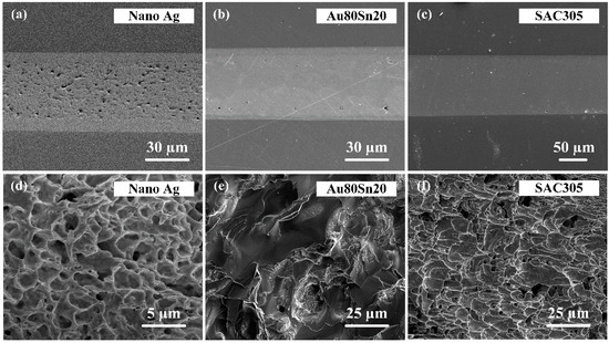 Cross-sectional of the bonding joints with (a) nano-Ag, (b) Au80Sn20, and (c) SAC305. (d–f) Fracture surface morphology of the bonding joints with different materials.