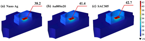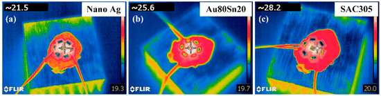 Thermal images of LED packaging with (a) nano-Ag, (b) Au80Sn20, and (c) SAC305.