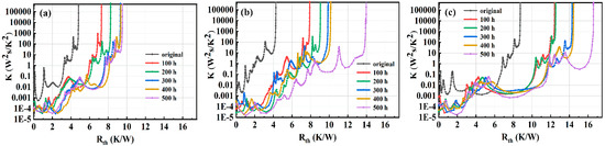 Differential thermal resistance of LED under different aging time packaging with (a) nano-Ag, (b) Au80Sn20, and (c) SAC305.