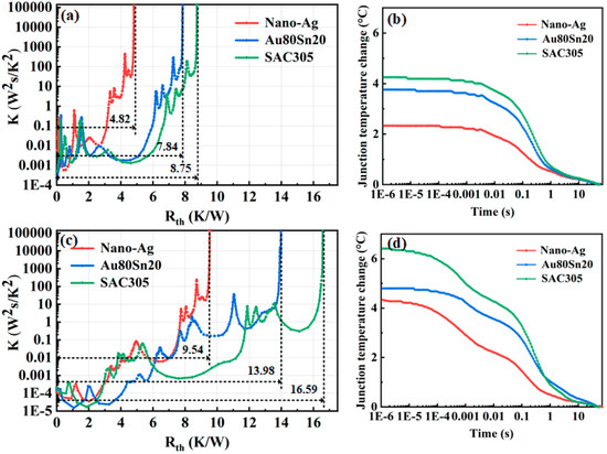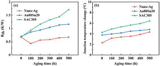 Figure 7a shows the differential thermal resistance of LED with different bonding materials before aging. The total thermal resistance of LED packaged with nano-Ag, Au80Sn20, and SAC305 is 4.82, 7.84, and 8.75 K/W, respectively. The total thermal resistance of nano-Ag sample is 38.5% and 44.9% lower than that of the Au80Sn20 and SAC305 sample. After aging for 500 h, the total thermal resistance of nano-Ag, Au80Sn20, and SAC305 sample is 9.54, 13.98, and 16.59 K/W, which are 4.72, 6.14, and 7.84 K/W higher than before, as shown in Figure 7c. The T3ster calculated the corresponding relationship between temperature change over time through the temperature coefficient (mV/°C), and its junction temperature change curves are shown in Figure 7b. The junction temperature change of the LED packaged with nano-Ag, Au80Sn20, and SAC305 was 2.33, 3.76, and 4.25 °C before aging, which increased to 4.34, 4.81, and 6.41 °C after aging, respectively. Through the aging test, the thermal resistance and junction temperature of the devices all increased, indicating that the long-term high-temperature working could accelerate the aging of packaging materials and reduce the heat dissipation efficiency of device. In this process, the LED packaging with nano-Ag paste always maintained the lowest total thermal resistance and junction temperature, demonstrating its excellent thermal conductivity and high temperature stability.