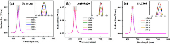 Figure 9a shows the spectra of LED with nano-Ag under different aging time. The driving current was 350 mA. As the aging time increased to 500 h, the spectral intensity increased first and then decreased, which is consistent with the rule above. Figure 9b,c display the spectra of Au80Sn20 and SAC305 sample, which spectral intensity decreased gradually with the increasing aging time. The spectral intensity of nano-Ag sintered LED was always higher than those of the Au80Sn20 and SAC305 sample. This may be due to the good thermal conductivity of nano-Ag, which converts the total power more into the optical power, improving the spectral intensity and optical efficiency of LED.