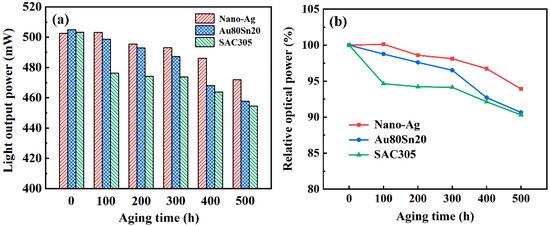 Figure 10a shows the light-output power of LEDs under different aging times. The LED samples with different bonding materials had a similar light output power before aging. With the increase of aging time, the light-output power of LEDs with Au80Sn20 and SAC305 decreased gradually, while the light power of nano-Ag sample increased first and then decreased slowly. Figure 10b presents the light power attenuation after different aging times. The light power of the nano-Ag, Au80Sn20, and SAC305 sample after aging is 6.1%, 9.3%, and 9.7% lower than before aging, respectively. Nano-Ag has better heat dissipation performance and high-temperature resistant. The heat generated by LED in the lighting process could be better dissipated through the nano-Ag interconnection layer and improve the light efficiency.