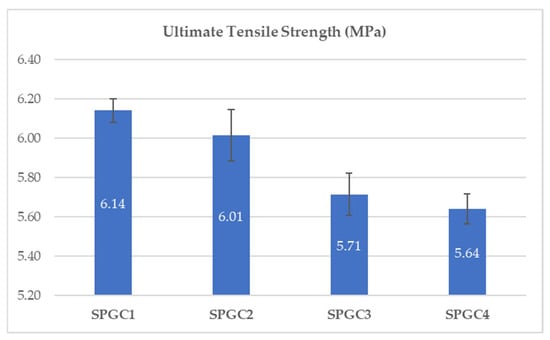 The composite films need to have appropriate mechanical properties in order to provide an individual with physical protection for wounds. In order to determine the tensile strength of the starch-based/PVA matrix in response to increasing citric acid (CA) concentrations, a series of experiments was carried out. As shown in Figure 1, the films’ ultimate tensile strength ranged between 5.64–6.14 MPa, in spite of the slight increase in the amount of CA in the solution. CA was found to not only affect plasticization but also induce crosslinking within the polymer matrix during this experiment. In this paper, since the thicknesses of the samples used in determining the ultimate tensile strength are relatively close, the effect of the samples’ thicknesses on the dressings’ ultimate tensile strength is negligible.