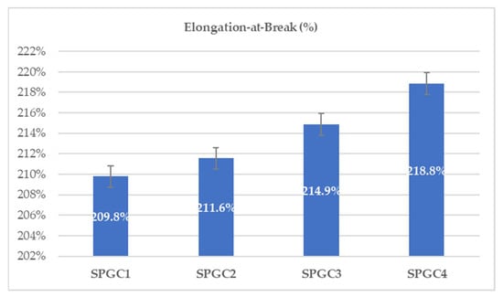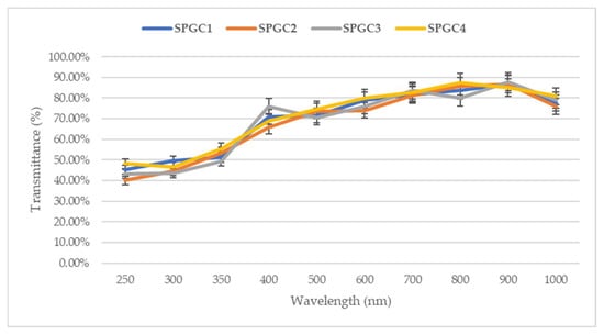 The reflective properties of the starch-based/PVA samples (SPGC1-SPGC4) were measured to observe the materials’ light absorption (Figure 7). At a lower wavelength, the transmittance average percentage is around 45% and increasing. What stands out in Figure 7 is a sharp rise in the transmittance value at 400 nm wavelength, which could be due to the complexation between polymers, plasticizer (citric acid), and crosslinking agent (glycerol). Additionally, the samples (SPGC1-SPGC4) showed the same response based on the fact that these materials are transparent and have all the same polymer structures.