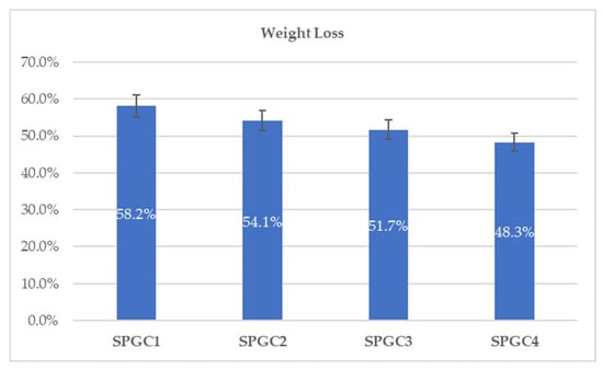 A weight-loss study of starch-based/citric acid films (SPGC1-SPGC4) was conducted after 14 days of degradation in phosphate-buffered saline (7.4 pH). Compared to one another, samples’ weight loss was reduced slightly, and the weight loss value for SPGC1, SPGC2, SPGC3, and SPGC4 samples was recorded at 58.2%, 54.1%, 51.7%, and 48.3%, respectively (Figure 4). During the degradation of polymers, water plays an integral role by accelerating enzyme diffusion into polymer chains and resulting in chain cleavage [36]. An ester bond in a film provides resistance to moisture (water) penetration [29] and an increase in hydrophobicity. Consequently, the degradation of starch/PVA membranes is mainly caused by the breakdown of crosslinking segments created by CA between the PVA and starch molecular structures. As a result, the biodegradation rate decreased by increasing CA percentages in the formulation of the materials. This trend is consistent with those reported in the related literature [14,15].