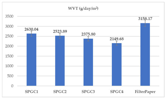 An optimal water vapor transmission (WVT) rate of 2000–2600 g/m2/day is crucial to avoiding dryness of the wound due to the fact that low humidity and the accumulation of exudates in the wound area might lead to bacterial infection [37]. On the other hand, the type of skin wound defines the WVT rate; in other words, the first-degree burns and the granulating wounds need the WVT of 300 and 5000 g/m2/day, respectively [37,38]. The starch-based/PVA/CA blends (SPGC1-SPGC4) WVT were assessed from 2630.04 g/m2/day to 2149.68 g/m2/day (Figure 5). Compared to a relatively porous material, such as filter paper, the starch-based materials revealed adequate water vapor transition rates implemented in wound dressings to provide enough humidity to have the best wound-healing steps.