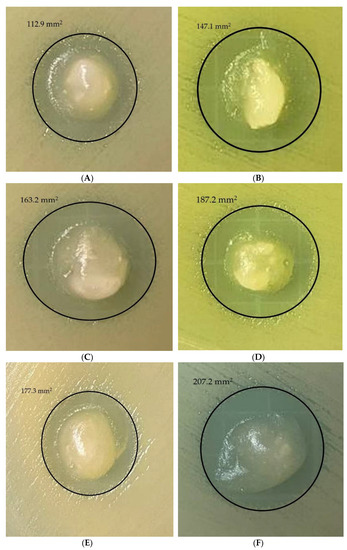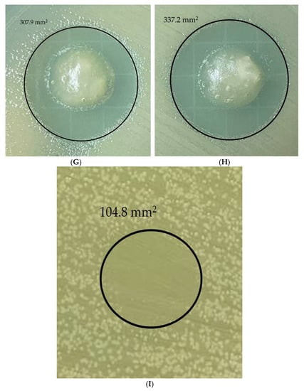 In vitro tests were conducted using starch-based films and penicillin as a control (Figure 6I) against Staphylococcus aureus (Gram-positive bacteria) and Escherichia coli (Gram-negative bacteria). According to Figure 6, all starch/PVA/CA films showed negative bacterial growth around the film surface area by creating a clear, circular inhibition zone against E. coli (Figure 6A–D) and S. aureus (Figure 6E–H). A high level of antibacterial efficacy was demonstrated by the starch-based dressings prepared with 1.38 wt% and 1.83 wt% of CA among all samples tested. The starch-based composite film with a CA concentration of 1.83 wt% was found to be the most effective against E. coli and S. aureus, with inhibition zones of 187.2 mm2 (Figure 6D) and 337.2 mm2 (Figure 6H), respectively.