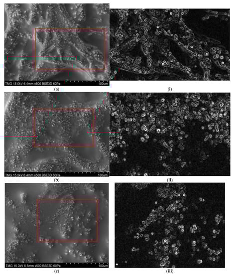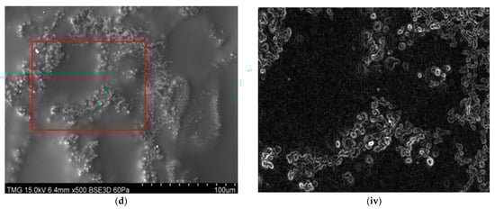 The SEM photographs that are commonly used to study surface morphology and density of composite films have been used to analyze a wide variety of composite films. Taking into account the upper surface images, it has been determined that increasing citric acid contents from 0.46 wt% to 1.83 wt% in the starch-based/PVA composite films did not significantly alter their surface morphology (Figure 8a–d). A partial section of each SEM image, without changing the magnification, was processed and analyzed by ImageJ software (Figure 8i–iv), indicating that citric acid may help distribute, interconnect, and integrate throughout the polymer matrix of the films. Crosslinked polymer chains formed a densely packed structure due to their crosslinked networks (Figure 8i–iv). Each of the images (i–iv) in Figure 8 was analyzed utilizing the ‘find maxima’, ‘find edges’, and ‘enhanced contrast’ functions of the ImageJ software (8-bit; 96 K; 1.53 k; National Institutes of Health, Bethesda, MA, USA).