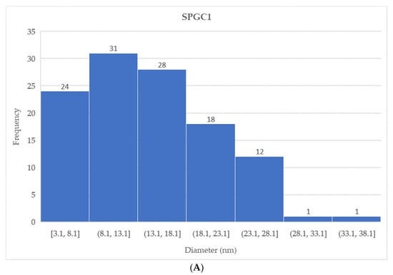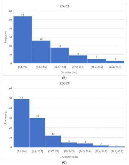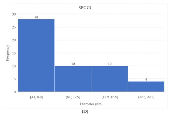 As shown in Figure 8, the selected areas of the SEM images analyzed by the open-source ImageJ software package demonstrate the micro-sized clusters of starch granules and the edges of the peaks and depths on the material’s surface. Moreover, the distribution and area of starch clusters on the surface of each material (SPGC1-SPGC4) were calculated (Figure 9). The total number of cluster peaks for each sample confirms that the surface becomes smoother as each solution’s citric acid content increases. For example, the total number of peaks on the SPGC1 sample surface was recorded at 115 compared to 52 points on the surface of SPGC4.