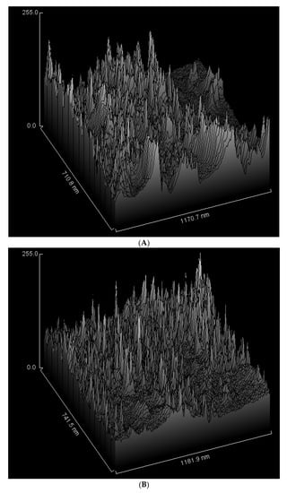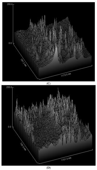 Additionally, in order to assess the samples’ surface roughness further, the same selected areas in Figure 8 were used to generate surface plots using ImageJ software, as shown in Figure 10. It can be concluded that various sizes of clusters were created in the sample structure matrix; small ones are well embedded in the PVA and the citric acid structure, where the surface is smoother, and the rest of the area is rougher and where the broader and taller clusters were created. Those larger clusters are starch particles that have not been fully embedded in the structure matrix; therefore, they act as space fillers in the gaps between PVA and citric acid.