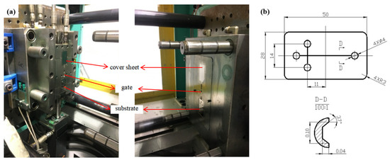 (a) The integrated mold with the function of both injection molding and the in-mold bonding process, (b) top view of the substrate of the microfluidic chip (unit mm).